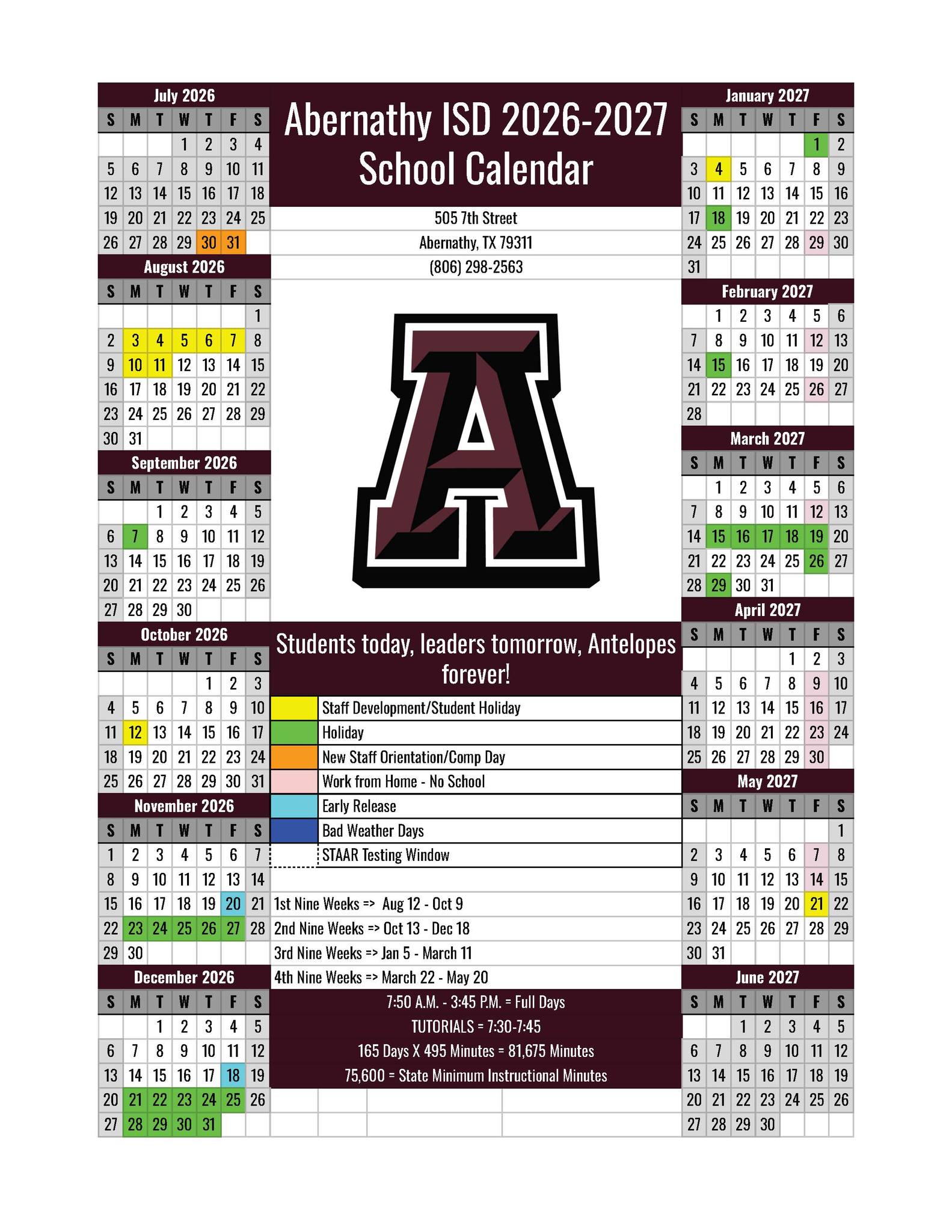 Here is the 2026-27 School Calendar! This has been board approved and the graduation date will be announced at a later date.